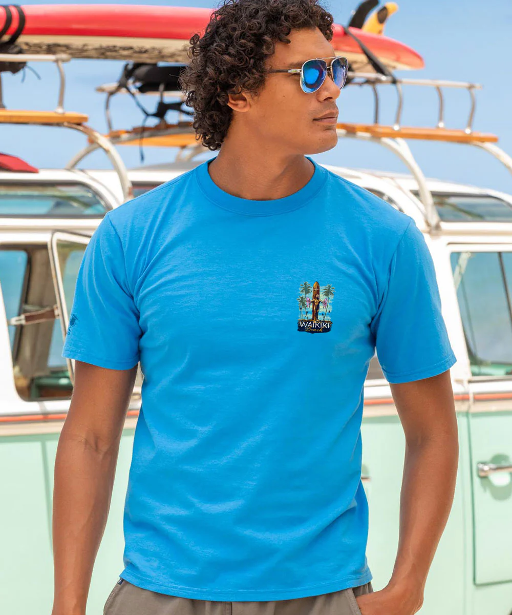 Located not far from where Duke was a waterman and a Waikiki Beach Boy teaching visitors to surf, this statue commemorates one of Hawaii's most popular and famous native sons. Known as the father of modern surfing we can think of no better way to honor this Olympic swimming champion than with this shirt that shows his bronze likeness against our classic Blue Hawaii color. Made using our exclusive specialty dying process that uses Blue Curacao and featuring 100% combed ring-spun cotton, this t-shirt has 50+ SPF protection to keep you feeling cool, calm and protected all year long. We only use environmentally friendly water-based inks that penetrate the material's fiber resulting in more vibrant colors, softer feel and artwork that doesn't crack or peel. Plus, it is proudly printed in the United States for quality you can see and designs that stand the test of time.