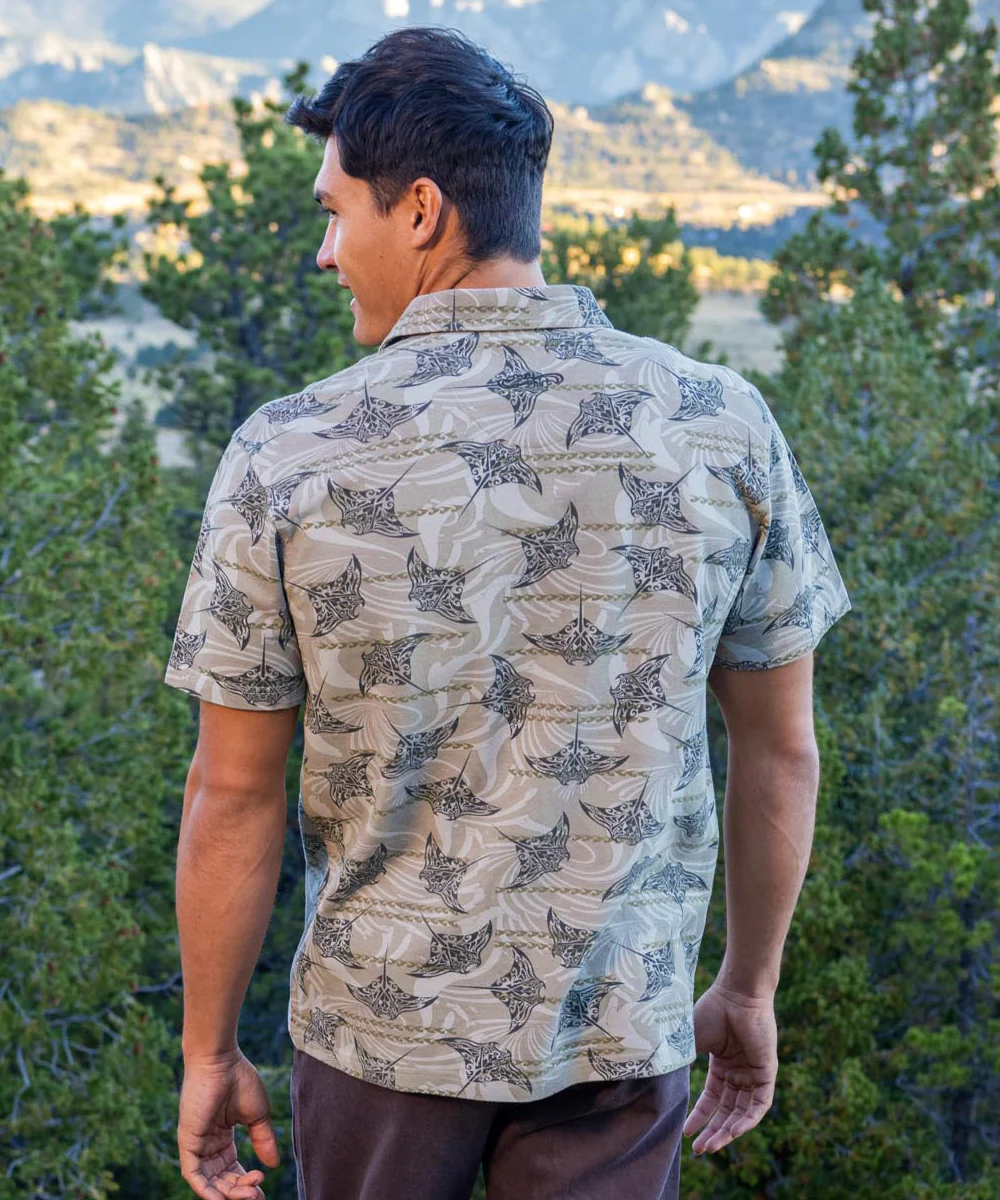 Flow into fashion with this easy-going, easy-on-the-eyes take on the Hawaiian shirt. Mixing waves and mantas gives it an extra boost of Aloha style and makes it great for wearing to a luau or beach party. Made using our special reactive print method that keeps colors fresh, these earthy and understated hues mean this polo can fit in anywhere from the beach to the boardroom. Since this style is an island treasure, we also guard its heritage by keeping the all-over artwork that is its hallmark. Of course, we also have to watch out for our own reputation for being a bit different, which is why we've switched it to a polo and used a pique weave on the soft 100% cotton. The result is stylish take on the casual classic that will help you make a name for yourself.