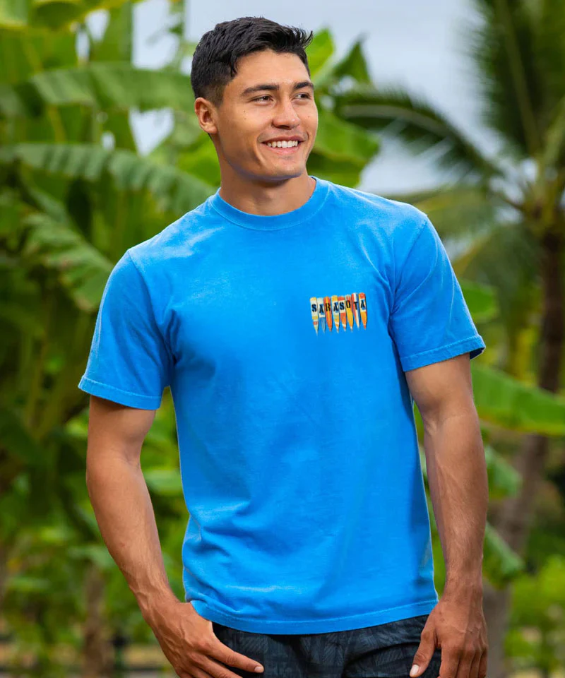 A colorful lineup of well-worn paddles, each one dipped in Sarasota charm. Weathered, vibrant, and full of character - just like the coastal town it celebrates. Made using our exclusive Blue Hawaii specialty dying process and featuring 100% combed ring-spun cotton, this t-shirt has 50+ SPF protection to keep you feeling cool, calm and protected all year long. We only use environmentally friendly water-based inks that penetrate the material's fiber resulting in more vibrant colors, softer feel and artwork that doesn't crack or peel. Plus, it is proudly printed in the United States for quality you can see and designs that stand the test of time.
