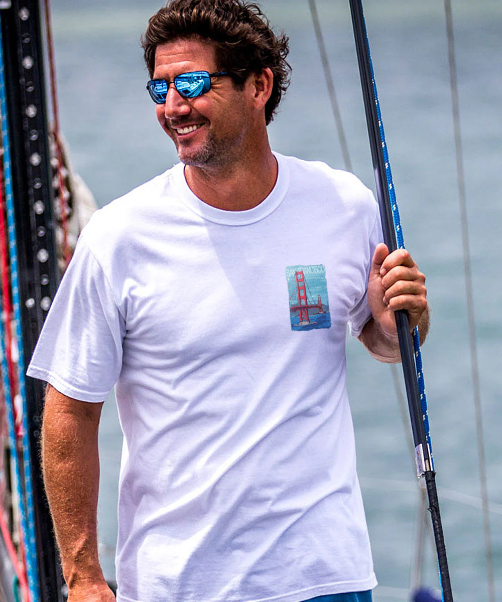 Artistry meets architecture in this exquisite original painting of the iconic bridge that has been called one of the top ten construction achievements of the 20th century. But more than that, this structure is symbolic of one of America's great cities we're excited to celebrate in this sharp T. Made from 100% cotton that is ring spun then combed, to remove impurities, this fabric is luxuriously soft and lightweight yet incredibly strong. We only use environmentally friendly, water-based inks that penetrate the material's fiber resulting in more vibrant colors, softer feel and artwork that doesn't crack or peel. Plus, it is proudly printed in the United States for quality you can see and designs that stand the test of time.