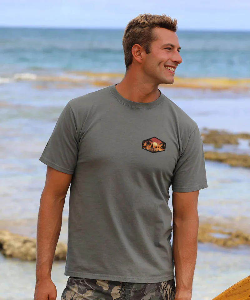 Crimson skies melt into calm waters as sails glide past swaying palms. It’s golden hour on island time - where every evening ends in a masterpiece. Made using our exclusive specialty dying process that uses real volcanic ash and featuring 100% combed ring-spun cotton, this t-shirt has 50+ SPF protection to keep you feeling cool, calm and protected all year long. We only use environmentally friendly, water-based inks that penetrate the material's fiber resulting in more vibrant colors, softer feel and artwork that doesn't crack or peel. Plus, it is proudly printed in the United States for quality you can see and designs that stand the test of time.