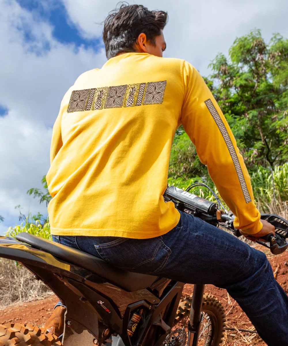 Our local artists are throwing it back to Ancient Hawaii with this design that employs one of the islands' most revered creative techniques: tapa cloth artwork. Contrasting the natural brown geometric patterns and symbols with the pineapple dyed material adds an extra bit of Polynesian panache to this lively tee. Made using our exclusive specialty dyeing process that uses real pineapple and featuring 100% combed ring-spun cotton, this t-shirt has 50+ SPF protection to keep you feeling cool, calm and protected all year long. We only use environmentally friendly, water-based inks that penetrate the material's fiber resulting in more vibrant colors, softer feel and artwork that doesn't crack or peel. Plus, it is proudly printed in the United States for quality you can see and designs that stand the test of time.