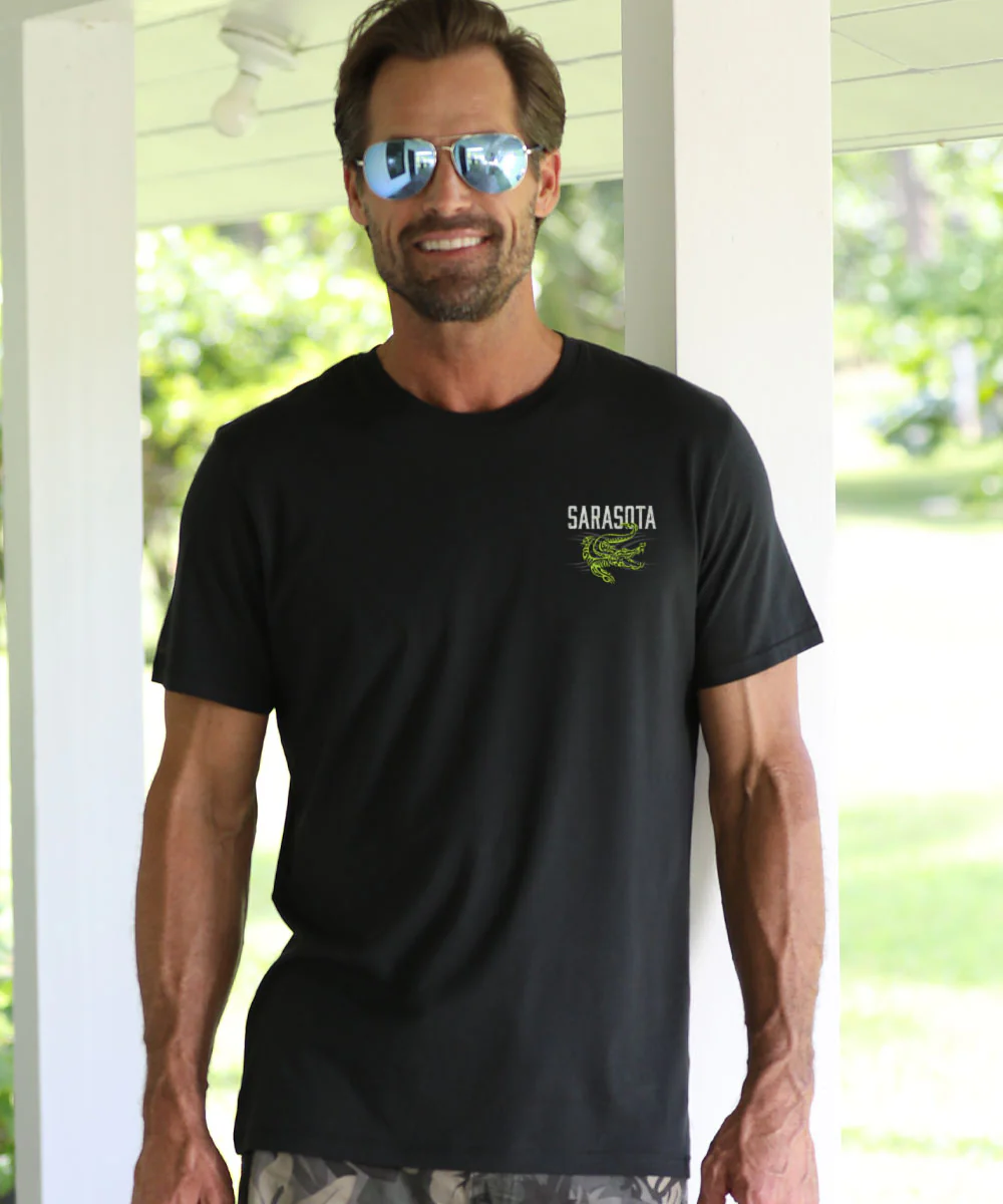 Bold and untamed, this Sarasota design pays tribute to Florida’s wild side. A tribal-style gator surges from the shallows in vivid green, backed by rugged lettering that captures the fierce spirit of the Gulf Coast. Already made with a luxurious fiber with brilliant luster, our Pima cotton Ts are finished with a special wash for ultimate softness and durability. We only use environmentally friendly water-based inks that penetrate the material's fiber resulting in more vibrant colors, softer feel and artwork that doesn't crack or peel. Plus, it is proudly printed in the United States for quality you can see and designs that stand the test of time.