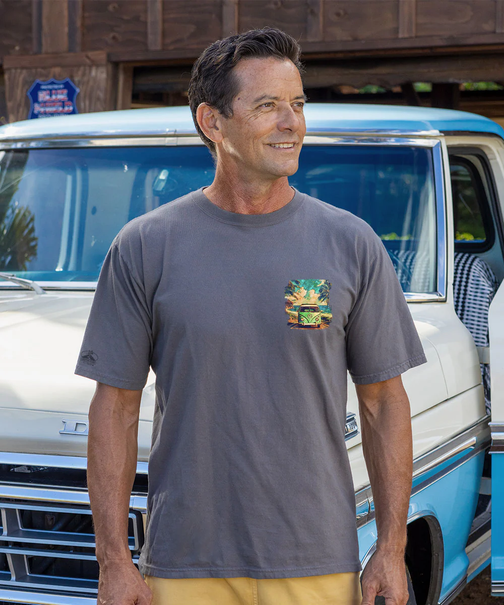 Maybe it's the fluffy clouds or heightened colors, but here's something dreamy about this original painting that draws us in. The thought of perfect weather and the promise of the open road before you might seem like a fantasy, but the great thing is that you can make this image a reality when you tour the islands in a VW bus. Made using our exclusive specialty dyeing process that uses real volcanic ash and featuring 100% combed ring-spun cotton, this t-shirt has 50+ SPF protection to keep you feeling cool, calm and protected all year long. We only use environmentally friendly, water-based inks that penetrate the material’s fiber resulting in more vibrant colors, softer feel and artwork that doesn’t crack or peel. Plus, it is proudly printed in the United States for quality you can see and designs that stand the test of time.