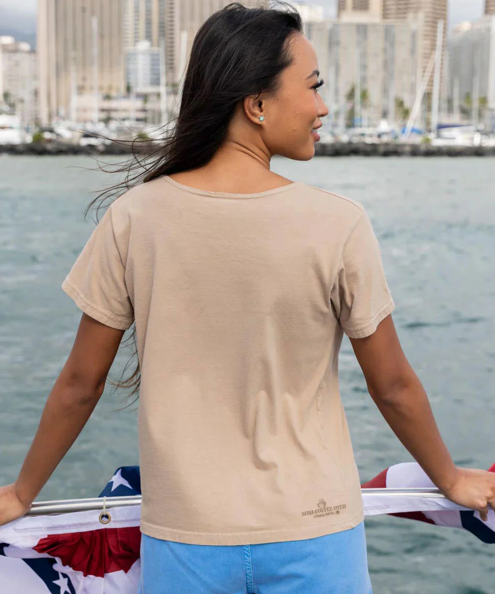 With this design you can wear your heart and patriotism on your tee. Full of red, white, and blue spirit, it's a shirt you'll love just as much as you love your freedom. Made from 100% cotton that is ring-spun, then combed to make it luxuriously soft, this tee also features a scoop neck and relaxed cut to be both cute and comfortable. The unique color comes from our Kona coffee specialty dyeing process. We only use environmentally friendly, water-based inks that penetrate the material's fiber resulting in more vibrant colors, a softer feel and artwork that doesn't crack or peel. Plus, it is proudly printed in the United States for quality you can see and designs that stand the test of time.